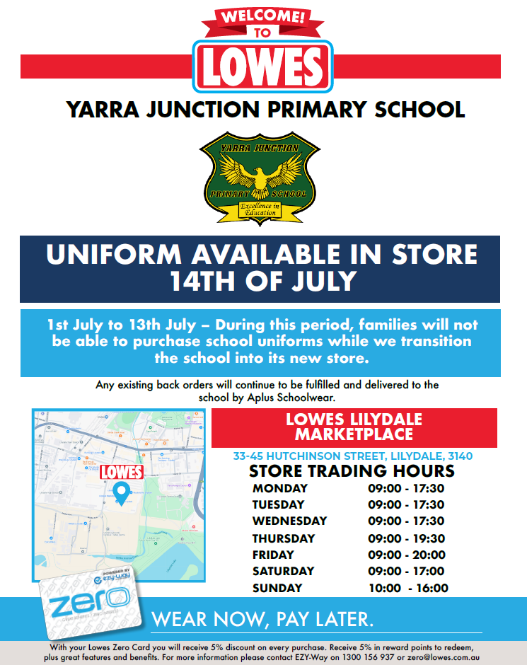 All students attending YJPS are expected to wear the Yarra Junction Primary School uniform.From the 14th July 2025, uniforms can be purchased from Lowes in Lilydale.